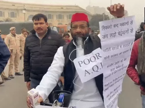 At the same time, the political atmosphere outside and inside the House remained tense. SP MLA Brijesh Yadav arrived at the Assembly carrying a bicycle with a box labelled as “magic syrup.” The message on the box alleged that those who consume it die, while those who sell it become wealthy and receive political protection before fleeing abroad. Similarly, SP MLA Mukesh Verma came wearing a poster demanding action against “big names” allegedly involved in the syrup case and questioning when bulldozer action would be taken against them.
